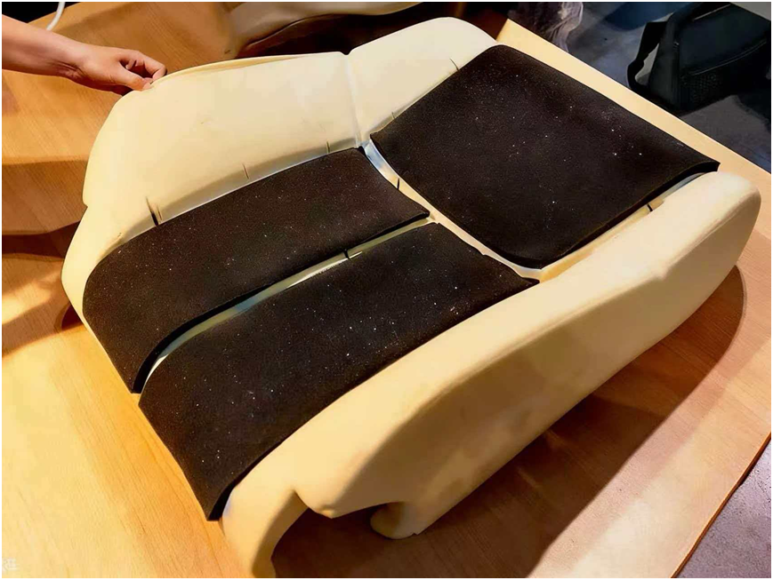 座椅廠可以直接讓涂布復(fù)合廠提供符合標(biāo)準(zhǔn)的帶膠舒適棉,收到后直接定位按壓即可貼牢。
