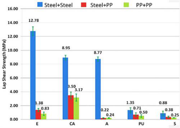 在金屬與金屬的結(jié)合中,所有的5項(xiàng)測試均可進(jìn)行。而對于金屬與聚丙烯、聚丙烯與聚丙烯的結(jié)合,則只能進(jìn)行剪切應(yīng)力測試。實(shí)驗(yàn)中對每種底層材料與粘結(jié)劑的結(jié)合均準(zhǔn)備了5個樣品。