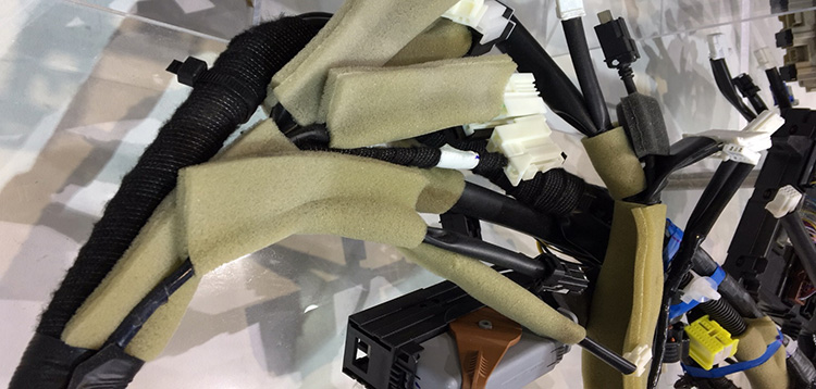 汽車(chē)線(xiàn)束是汽車(chē)電路的網(wǎng)絡(luò)主體,就好比遍布人體傳導(dǎo)大腦信號(hào)的的神經(jīng)組織,汽車(chē)線(xiàn)束也是遍布汽車(chē)的各個(gè)電子部件和照明部件。而要纏繞、固定這些不同功用的汽車(chē)線(xiàn)束,也是十分重要的工作環(huán)節(jié)。線(xiàn)束包裹材料必須確保線(xiàn)束捆扎的穩(wěn)定可靠,并能承受高溫和嚴(yán)苛環(huán)境因素的影響。比如在發(fā)動(dòng)機(jī)艙,線(xiàn)束捆扎膠帶必須具有高耐磨性,而在乘客艙,線(xiàn)束捆扎膠帶則需要實(shí)現(xiàn)降噪的效果。線(xiàn)束固定也是高性能的膠帶應(yīng)用之一。 從車(chē)內(nèi)頂棚、塑料部件到車(chē)身,不同的線(xiàn)束需要固定在不同的被粘物表面以及不同的3D幾何構(gòu)造。